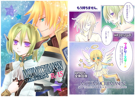 offline 2012/12/26 1/6 インテ参加詳細 13.1.6 COMIC CITY大阪92 3号館 O43a Estrelas サークルカット。 FF零式とSO4とゼノサーガ、ゼノギアスの本を持ち込み予定です。 (ゼノは恐らく机の上に余裕がないので置かないと思いますので、 ご希望の方いらっしゃったら声かけていただけたら幸いです。) あと、FF零式(A3)とSO4(エジフェイ)のお年賀ポストカードも配布予定です~! ポストカードは自家通販(常時受付中です)でもおつけできますのでお気軽にどうぞ。 以下発行物の詳細です。 ゼノサーガ・ゼノギアスについてはオフラインページ参照ください。 ・ドS<エース>来たれり ¥400 ※この本はHARUコミおよび9月FFオンリーで完売したコピー本 「ドS<エース>来たれり」「TREIJIRI!」2冊を 1冊にまとめてオンデマンドで再版したものです。 B5オンデマンド・24p FF零式A3中心トレイ受本です。 トレイ受というよりトレイいじめ?トレイいじり? A3中心+クオン×トレイ、K3、93、23 表紙・裏表紙 本文サンプル ・やっぱりエッチさんはZENRA! ¥200 B5コピー・14p SO4エジフェイエジ本です。 ひたすら全裸でいちゃいちゃしてるだけのバカップル本です。 本文見本 ・エッジさんMOTTO! ¥300 B5コピー・26p 神楽遊さん&なるみさんとのSO4エジフェイ合同本です。 ゲストに、fontnaさん、コカさん、ふむさん。 表紙裏表紙 本文見本(私のページ) 告知サイトはこちら。 こちらで、6人分のサンプルぺージもご覧いただけます。 ・MOUMOCHIMASEN ¥200 B5コピー・18p SO4フェイズ受エロショタギャグ本です。 エジフェイ中心、他ケイフェイ、バッカス×フェイズなど…。 エジフェイゲストに763さんをお招きしています! ・やっぱりエッチさんはエッジ! ¥500 B5オフセット・28p 神楽遊さん・砂糖佳さんとのSO4エジフェイ合同本です。 (サンプルは私担当のページのみです) ・Infinity ¥200 B5コピー・14p SO4フェイアミ個人誌。別称フェイズ厨二病本です。 ちょっとだけエジフェイ要素も…エッジ→フェイズ×アミナなカンジで。 ・やっぱりエッチさんはEROい! ¥300 B5コピー・24p 神楽さんとのSO4エジフェイ合同本です。 ゲストにfontna様、高見沢拓巳様。 (サンプルは私担当ページのみです) ・Brilliant Rose ¥300 A5オンデマンド・20p SO4エジフェイ中心フェイズ本個人誌です。 ちょっとだけケイとかアミナとか。 ・Rhapsody A5オフセット・20p ゼノサーガEp2本。 ・Eternal Heaven B5オフセット・28p ゼノギアス本 [0回]PR