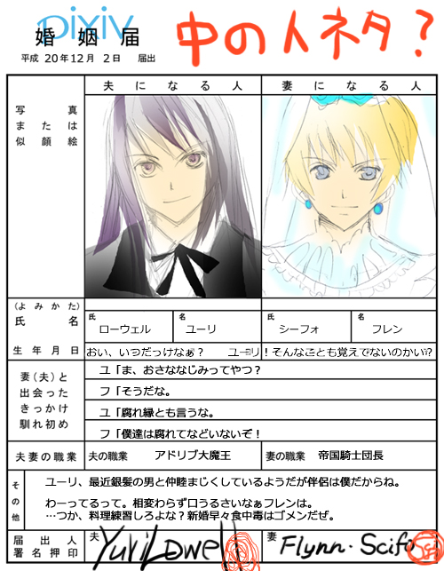 Fanart 2012/10/02 Tales of Vesperia うさみみユリデュ ヨーデル&エステリーゼ様 ボク女の子 オレら女の子? ユリフレ婚姻届 【腐向け】ヴェスペリアあれこれ by セリア on pixiv [0回]