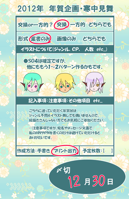 未選択 2011/11/01 【募集】2012年年賀状交換企画 今回も年賀状交換企画やりますー! 詳細は↓参照でお願いします。 イラスト描きさんじゃない方もお気軽にご参加ください。 pixivやmixi、twitterなど 他のSNSなどで私と交流のある方はそちらでメッセージいただけるとありがたいです。 連絡手段をお持ちでない初めましての方は、拍手もしくはメルフォでメールアドレス教えていただけたら そちらからご連絡いたします。 [0回]